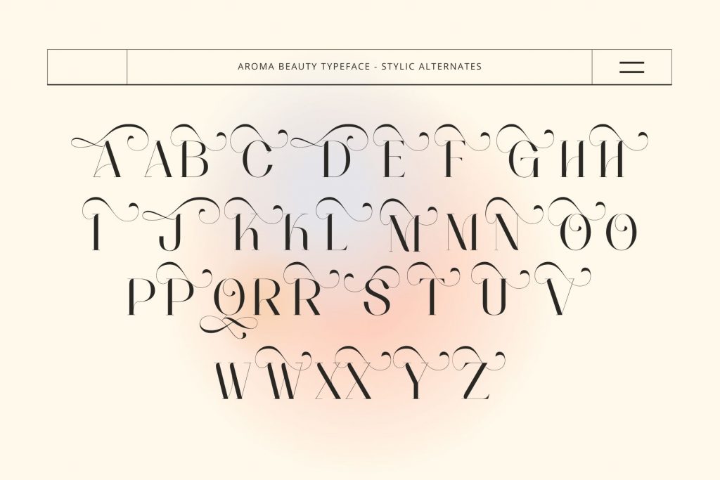 Aroma Beauty is a luxury typeface, full set of lowercase and uppercase letters, numerals and punctuation, multilingual symbols.